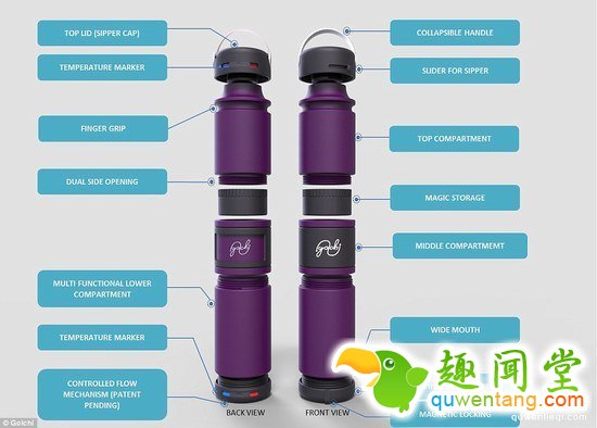 据英国《每日邮报》报道,美国芝加哥一发明团队设计了一款名为“Golchi”的智能运动水杯,不同于单功能普通水杯,它的功能特性多达15种。
