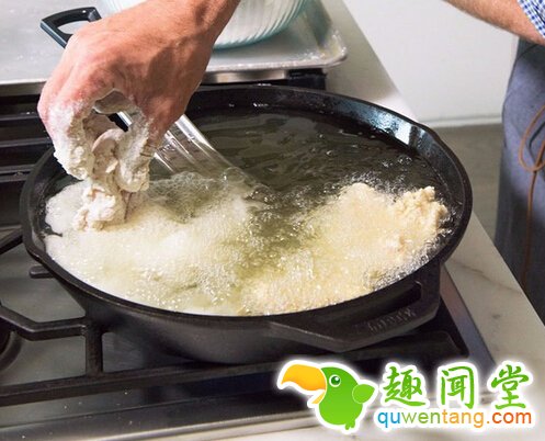 7 然后鸡肉慢慢的放进油锅里,一次2-3块这样炸,秘诀是要保证油温不要降下来