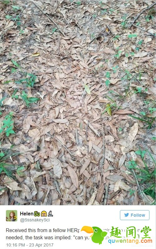 推特用户Helen分享了自己在野外所拍摄一张图,她表示,大家也许注意不到,图中实际上有一条蛇。