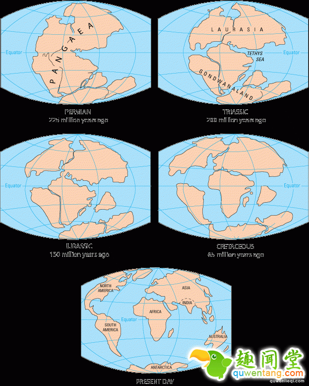 然而随着板块运动不断进行,各大洲开始分裂漂移,慢慢形成了现在我们熟悉的模样。从左上到最下,分别是2.25亿年前、2亿年前、1.5亿年前、6500万年前、以及现在的陆地。