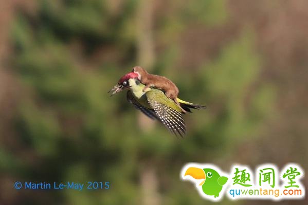 今年3月,一位摄影爱好者在东伦敦的公园里拍下了这张伶鼬踩在欧洲绿啄木鸟背上的照片。随后伶鼬掉到了地上,啄木鸟顺利逃脱了捕食者的攻击。